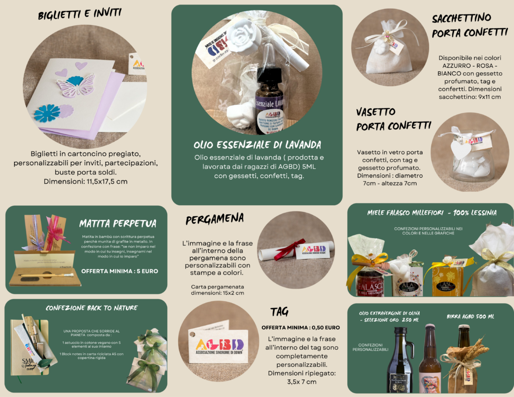 Scegliere le bomboniere solidali del nostro progetto “Occupiamoci” significa fare una scelta che va oltre il semplice regalo. Con il vostro dono, contribuite attivamente a sostenere un progetto che da anni si impegna a dare opportunità di crescita e inclusione a ragazzi con sindrome di Down.