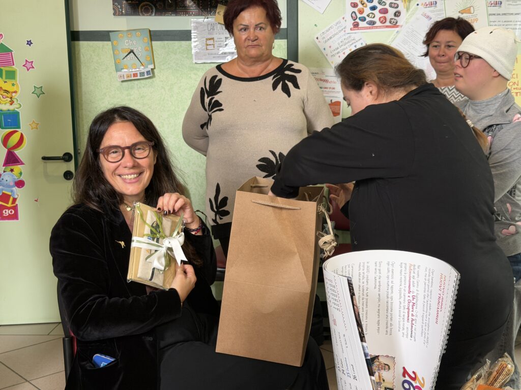 Al termine della presentazione, Emma e Arianna hanno consegnato personalmente al Ministro alcuni prodotti realizzati all’interno dei laboratori AGbD, simbolo tangibile del loro lavoro e del percorso di crescita che stanno portando avanti, gesto accolto con grande apprezzamento ed entusiasmo reciproco.